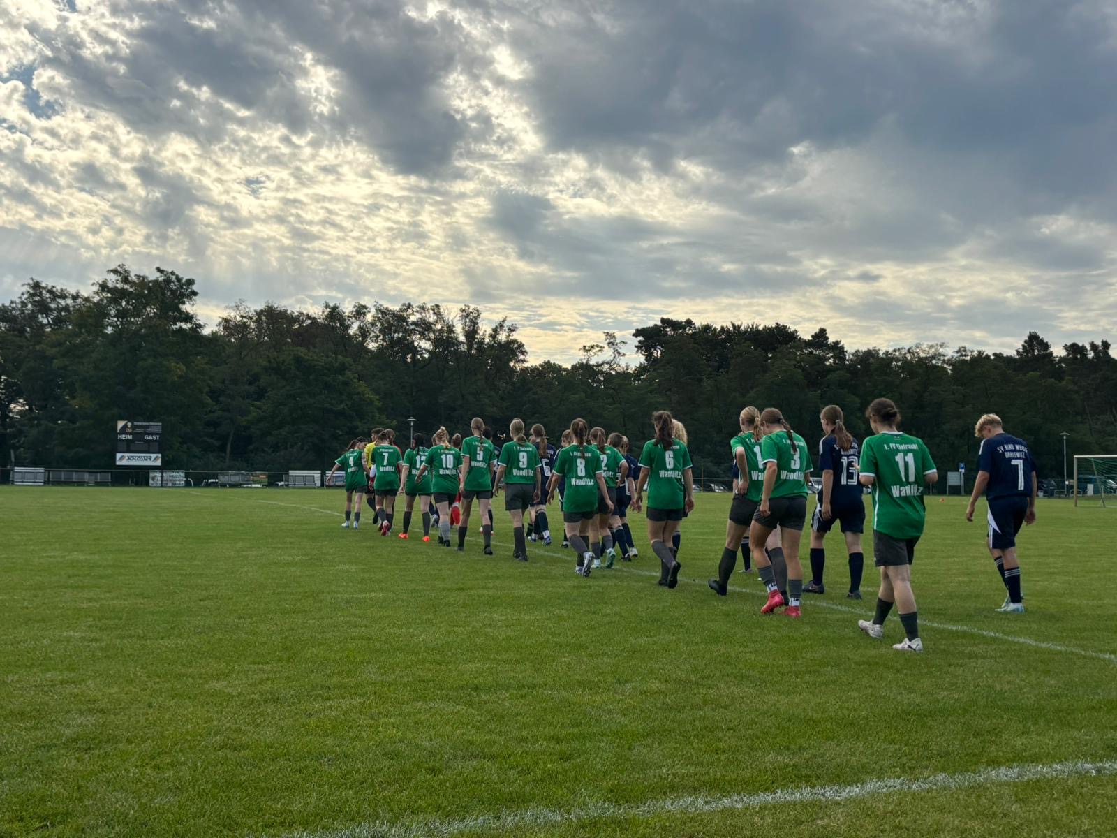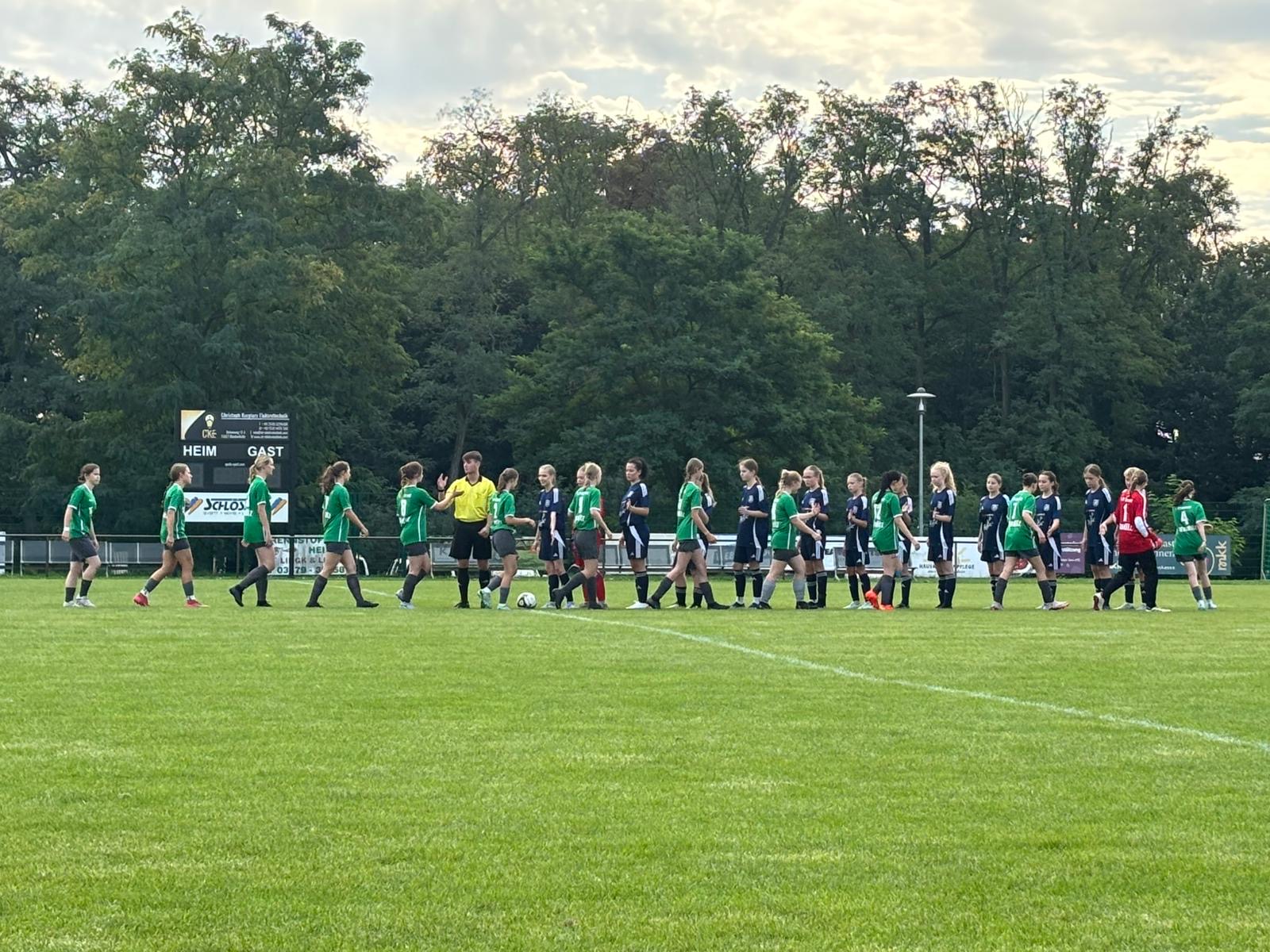 Der geplante Anpfiff verzögerte sich etwas, da der angesetzte Schiedsrichter nicht erschien. Bei warmen Temperaturen und dem hohen Rasenplatz waren die Bedingungen zudem anspruchsvoll. In den ersten 15 Minuten fanden wir kaum Zugriff auf das Spiel, unsere Torhüterin verhinderte mit mehreren starken Aktionen einen frühen Rückstand. Nach und nach kamen wir jedoch besser ins Spiel, gewannen mehr Ballbesitz und erarbeiteten uns zahlreiche gute Torchancen. In der 18. Minute folgte folgerichtig die verdiente 1:0-Führung. Dank der guten Kadergröße konnten wir regelmäßig rotieren, was unser Angriffsspiel variabel und gefährlich machte. Der Gegner fiel in dieser Phase vor allem durch harte Zweikämpfe und einige grenzwertige Fouls auf, während der Schiedsrichter oft fragwürdige Entscheidungen traf.